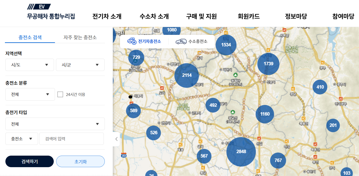 - 무공해차 누리집 → 도심 지역 충전소 상세 검색