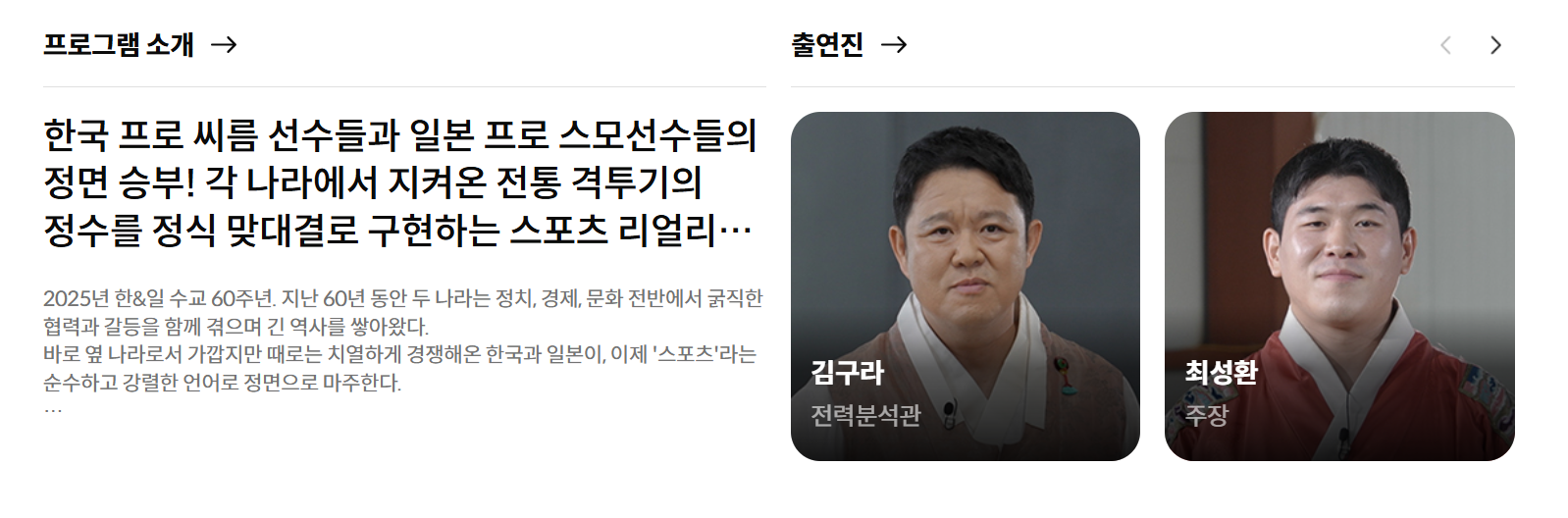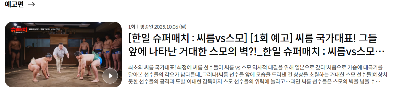 한일 슈퍼매치 : 씨름 vs 스모는 단순한 예능을 넘어, 전통과 명예, 국가 간 자존심이 맞붙는 초유의 리얼리티 스포츠 예능입니다.