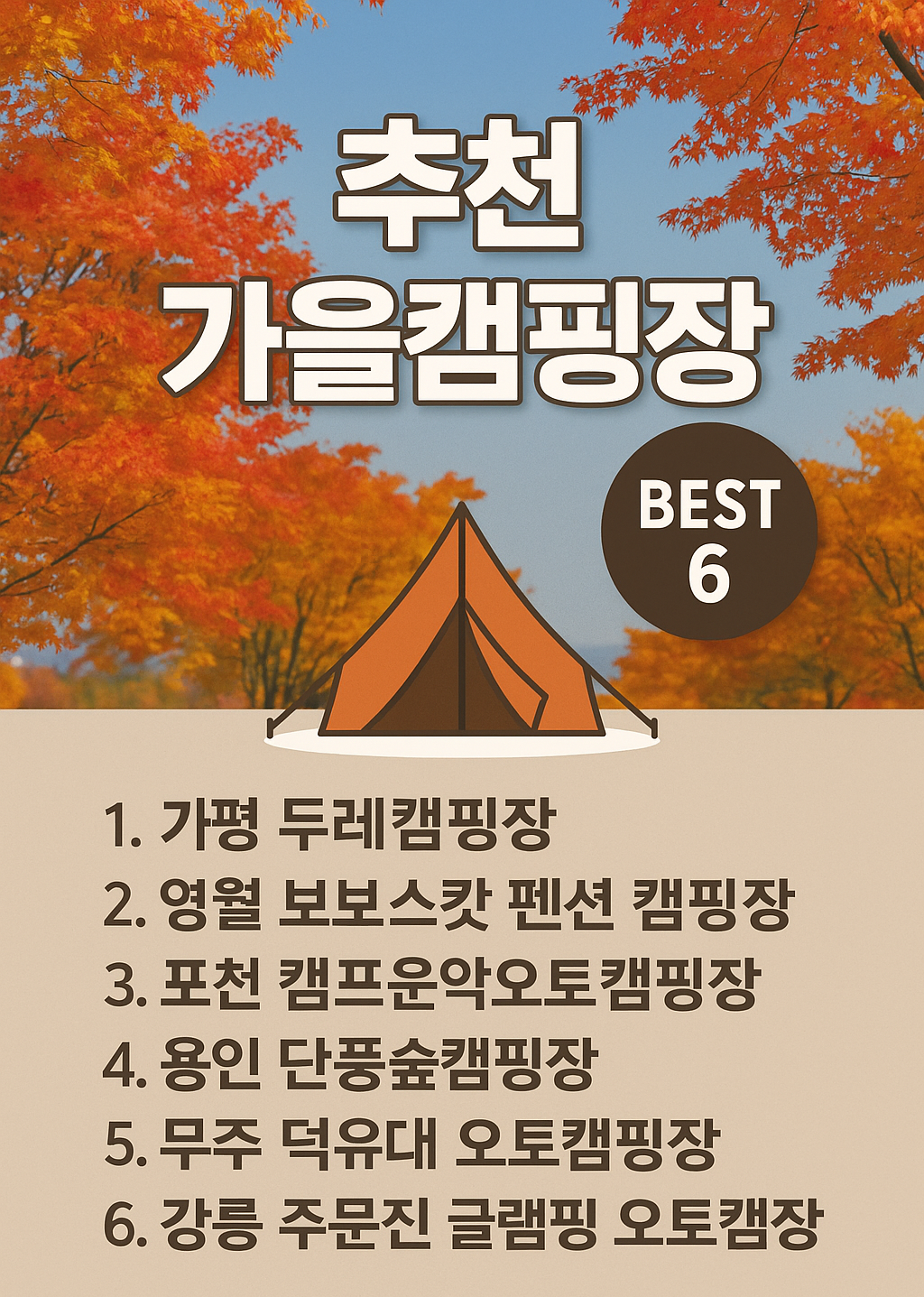 이번 글에서는 가족, 연인, 친구와 함께 즐기기 좋은 추천 가을캠핑장 BEST 6을 소개합니다.