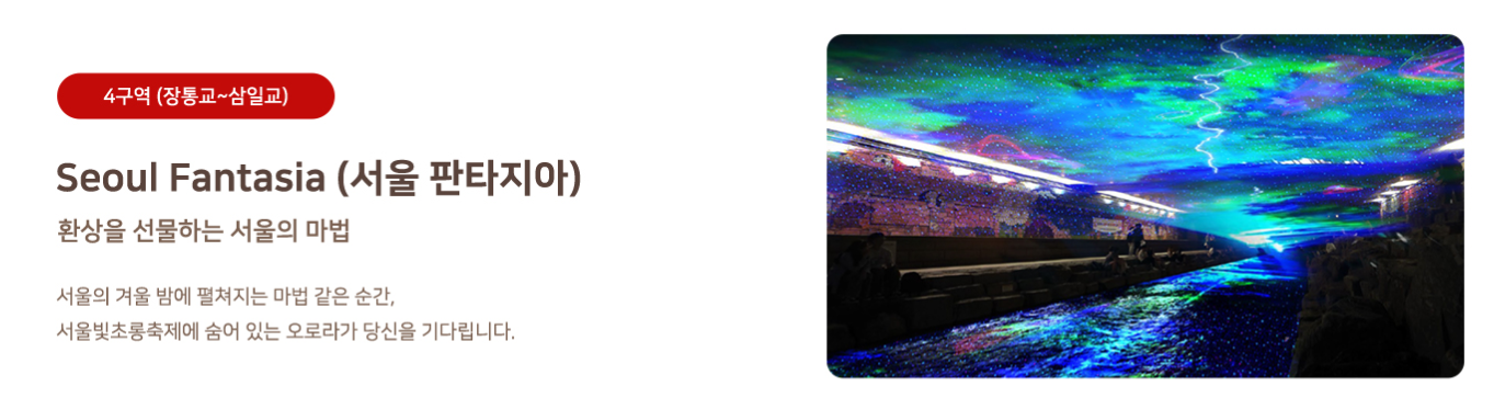 조명과 물소리가 어우러진 공간에서 인생샷을 남길 수 있고, 연말 분위기를 물씬 느낄 수 있는 감성 스팟입니다.