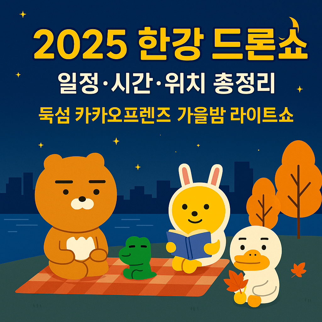 올해 가을, 서울의 밤하늘을 수놓을 2025 한강 드론라이트쇼가 돌아왔습니다. 특히 이번 드론쇼는 많은 분들이 사랑하는 카카오프렌즈와 함께하는 ‘서울가을’이라는 주제로 진행되어 더 큰 기대를 모으고 있어요.